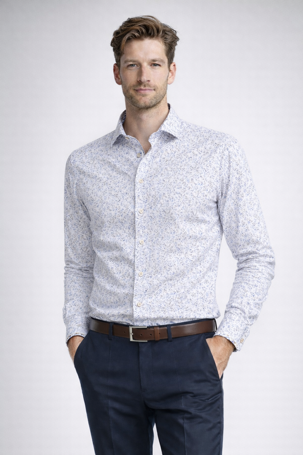 Chemise Marvelis blanche à  motifs, manches extra longues – Coupe ajustée – Spéciale homme grand – 100% coton