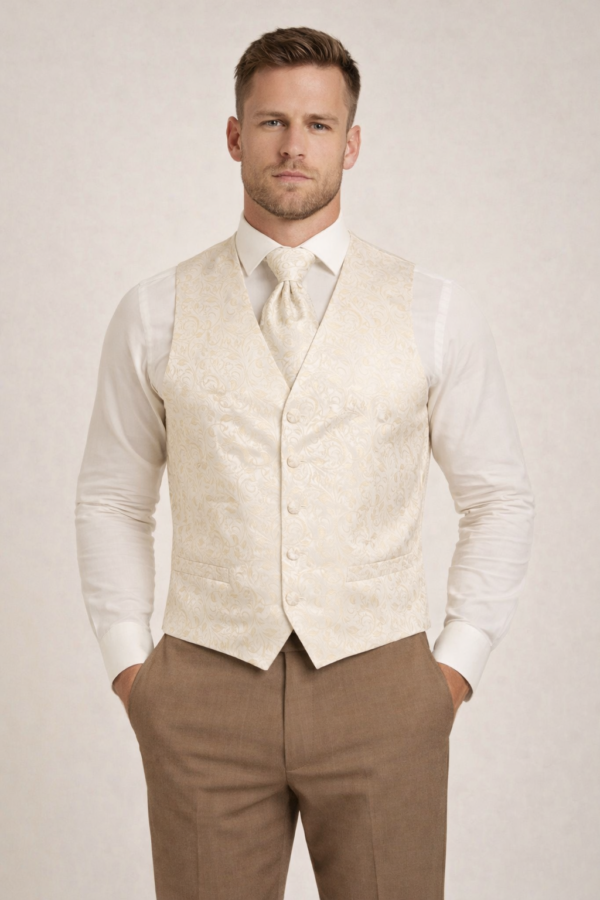 Affirmez votre élégance avec ce gilet de cérémonie Digel grande taille pour homme, confectionné dans un tissu raffiné à motif or. Idéal pour mariage et événements habillés, il se porte avec sa chemise ivoire et s’accompagne d’une lavallière pour un style plus traditionnel. Coupe moderne, finitions soignées et confort optimal spécialement adaptés aux morphologies généreuses