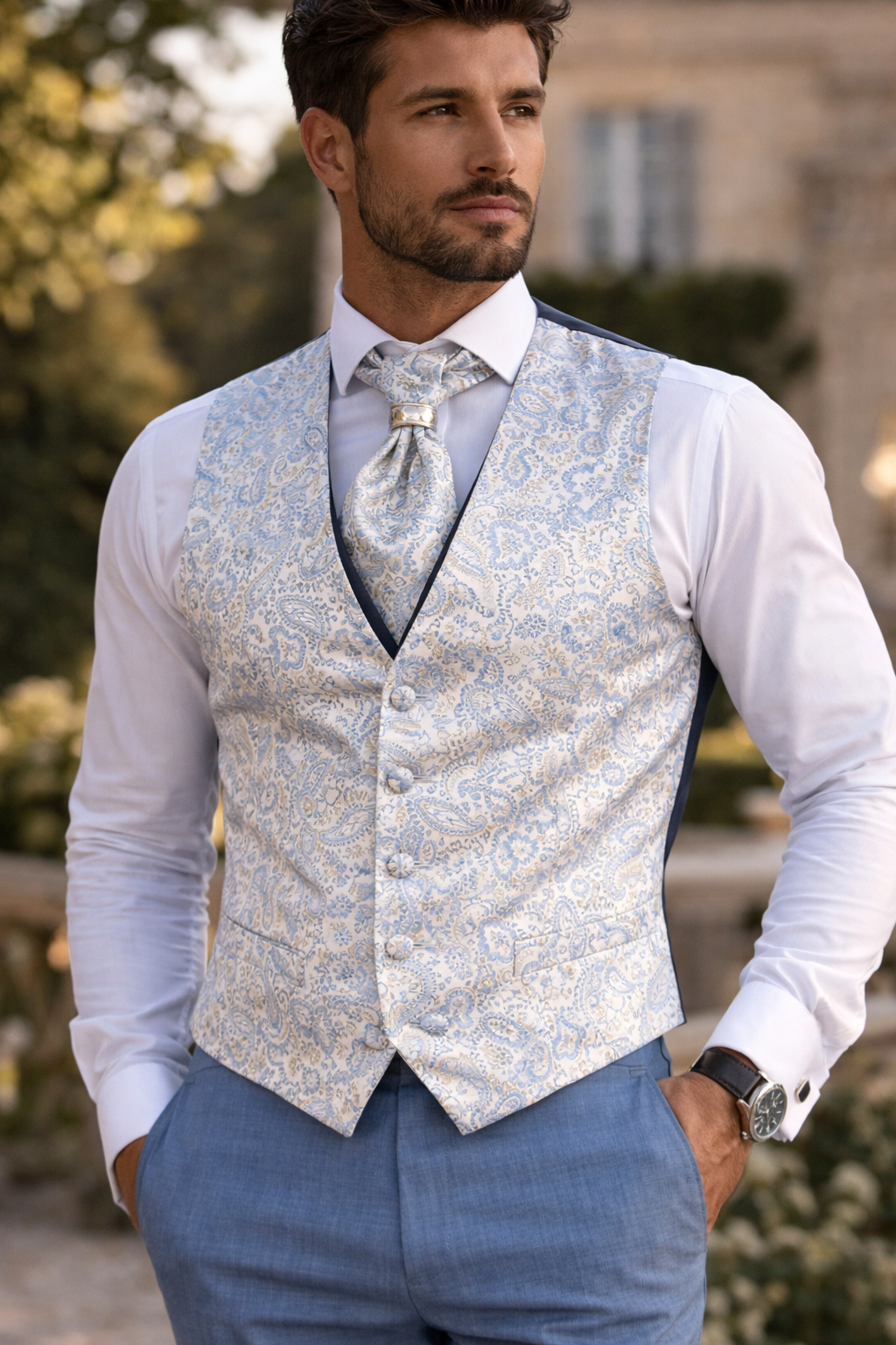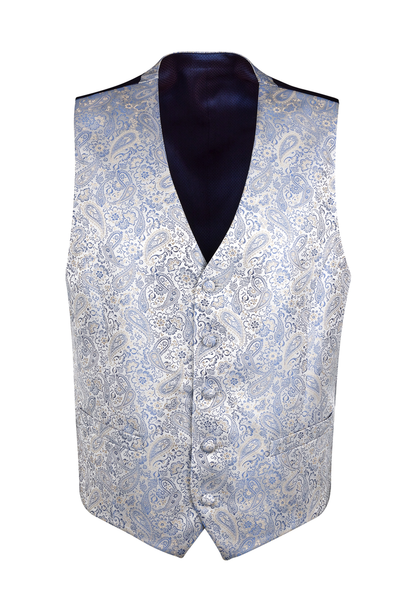 Affirmez votre élégance avec ce gilet de cérémonie Digel grande taille pour homme, confectionné dans un tissu raffiné à motif paisley bleu clair. Idéal pour mariage et événements habillés, il se porte avec sa chemise blanche ou ivoire et s’accompagne au choix d’un nœud papillon assorti ou d’une lavallière pour un style plus traditionnel. Coupe moderne, finitions soignées et confort optimal spécialement adaptés aux morphologies généreuses