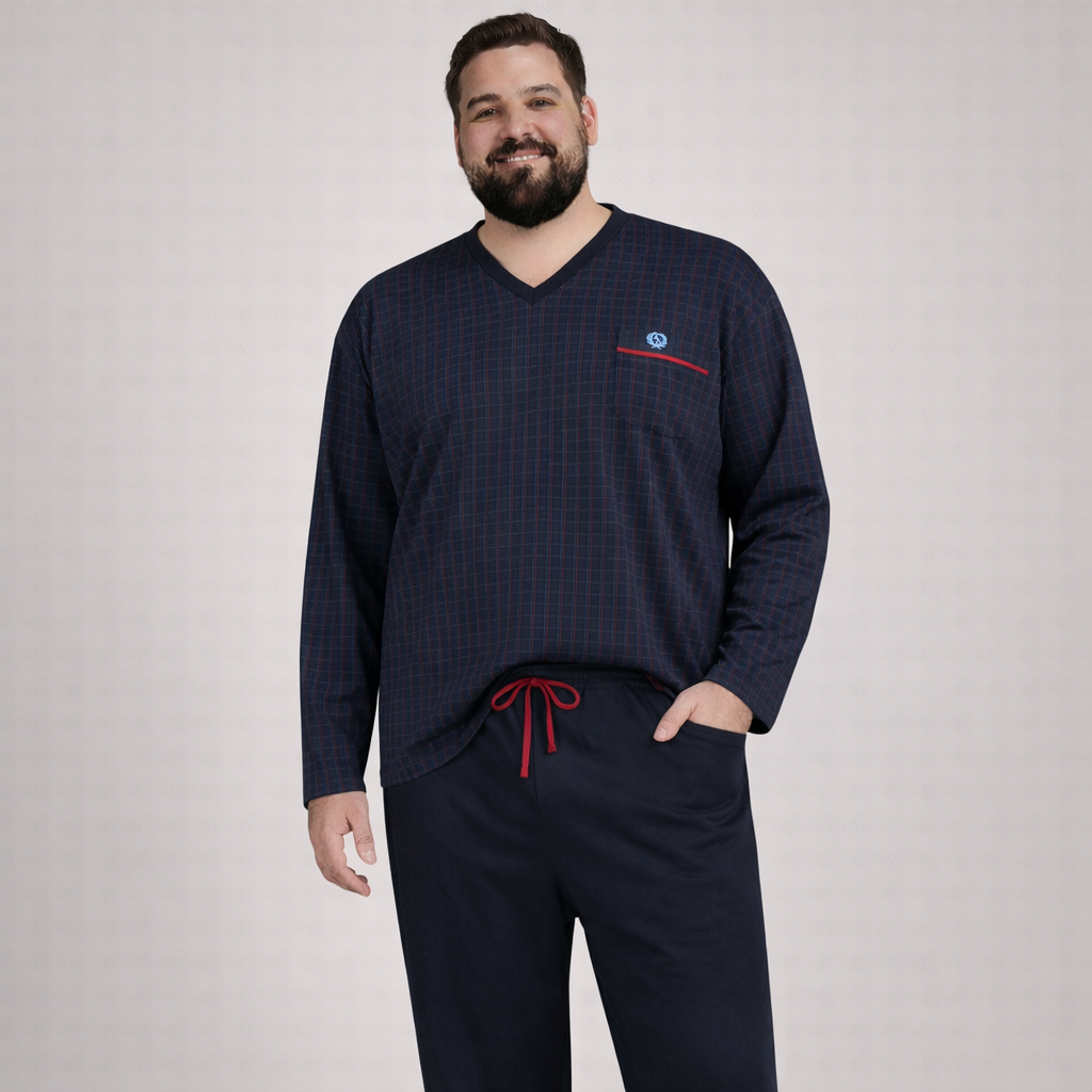 Ce pyjama long, grande taille Adamo dispose d’un haut à carreaux fondus et d’un pantalon uni avec bas droit et lacet de serrage. Cette fantaisie discrète apportera un peu de changement à votre tenue habituelle. Il est disponible jusqu’à la taille 8xl.